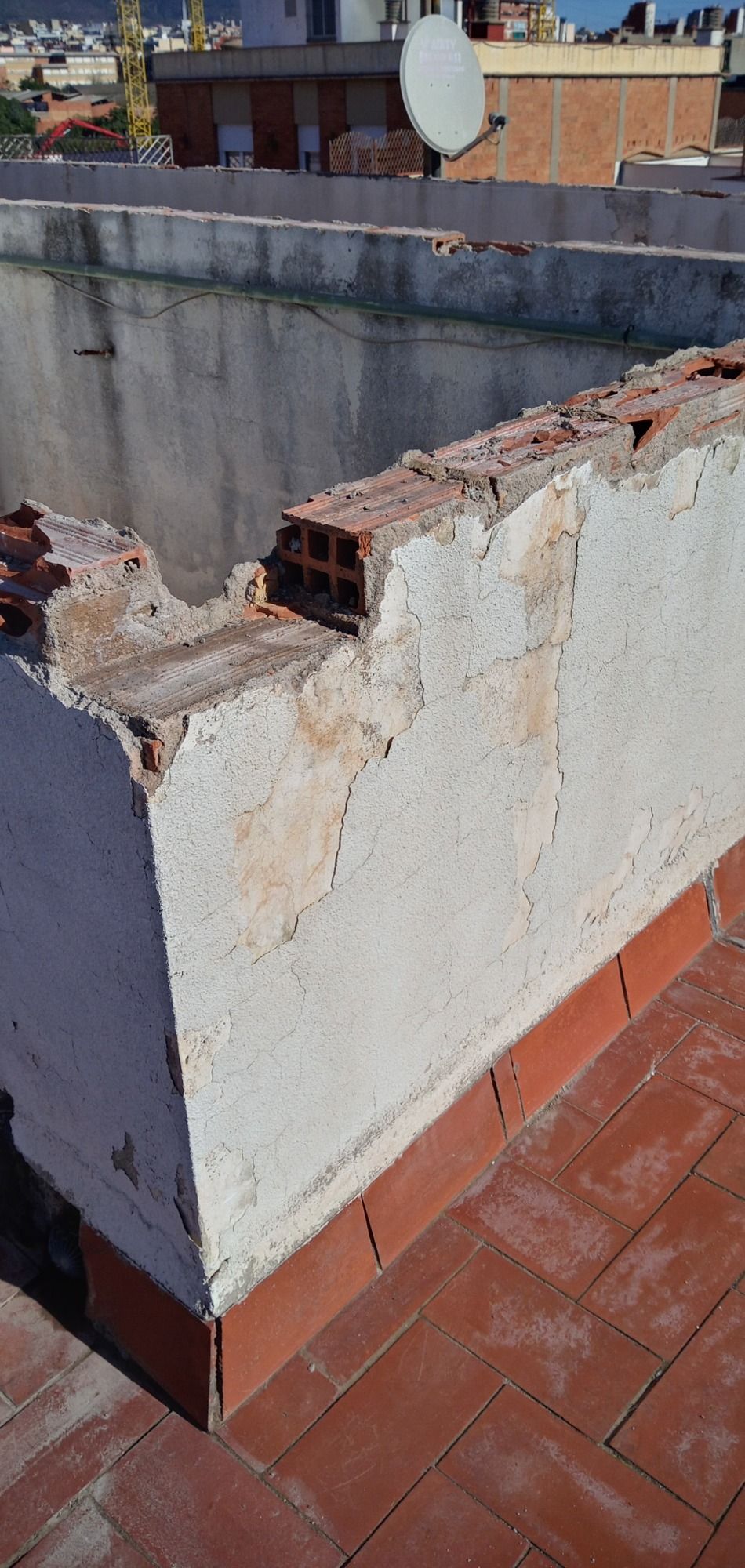 Reparación de paramentos de muretes de terrado. Cosido de grietas mediante lañas de acero inoxidable. Colocación de malla anti-fisuras. Suministro y colocación de cubre muros tipo Molins. Aplicación de una capa de fijador y dos de revestimiento 100% acrílico.